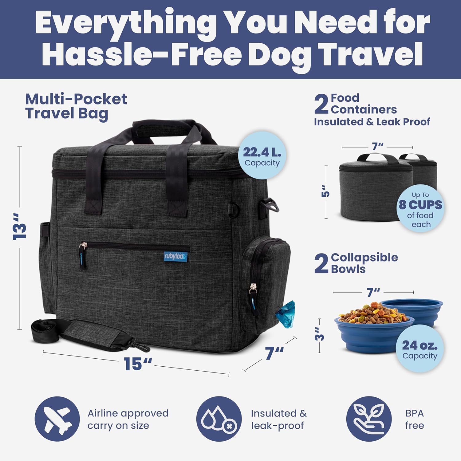 The Original Doggy Bag™- Dog Travel Bag for Supplies - Ultimate Gift for Dog Moms & Dads, Doggy Lovers & Pet Owners for Christmas- Includes 2 BPA-Free Travel Bowls and 2 Food Containers: Charcoal