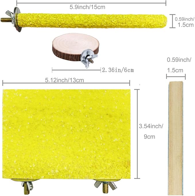 - 8 PACK BIRD PERCH STAND TOY : Perfect bird cage accessories toys to decorate your birds cage. You can get 6 parrot perch toys with one purchase.The parrot perch stand platform is 5.12 × 3.54 × 0.59 inch and two types of boards allow your pet to choose freely. The length of the paw grinding stick is 5.9 inch and the diameter is 0.59 inch