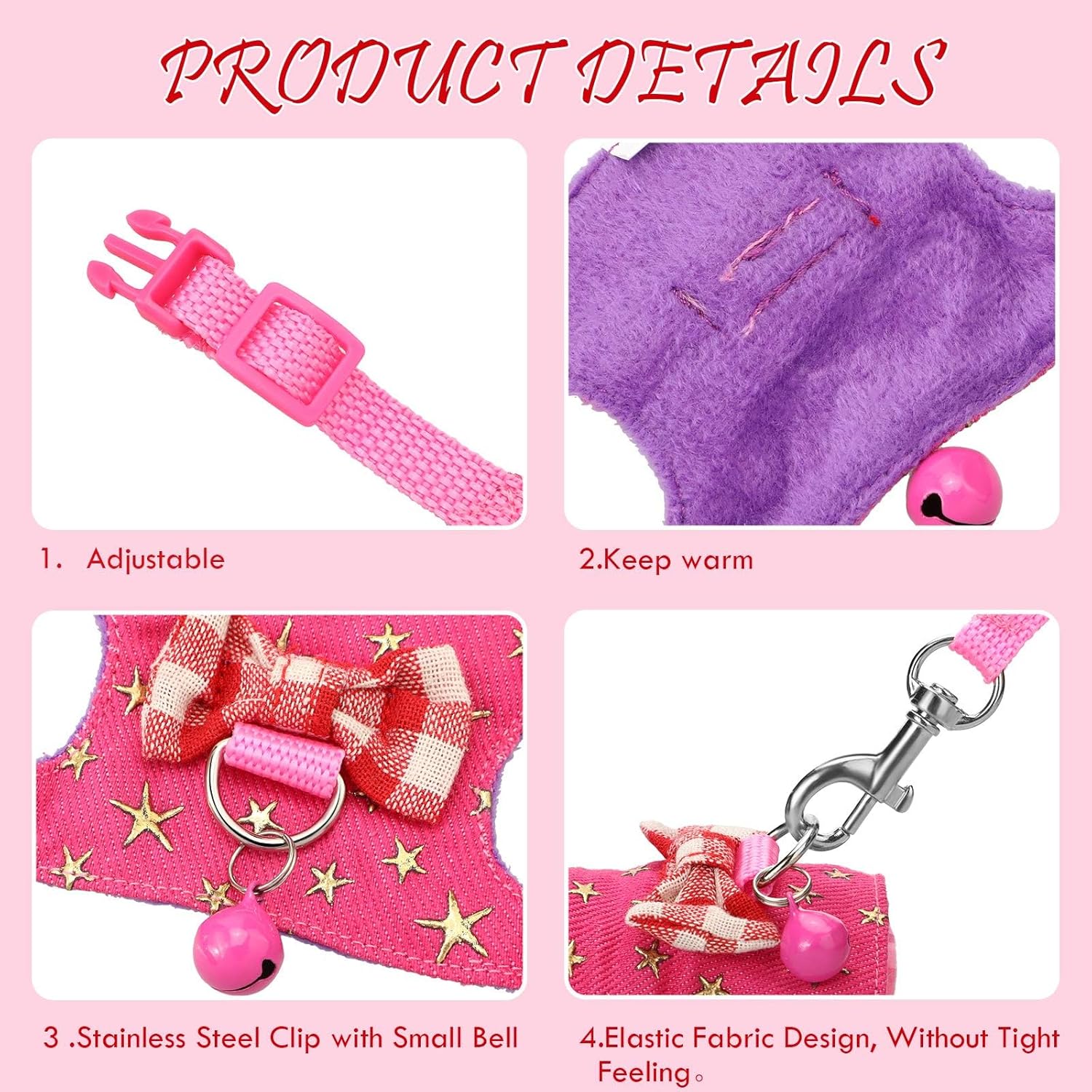 - Bell and bowknot ornaments: there is a leash with a length of 4.4 feet attached to the back of breathable puppy harness, pet owners can grasp it securely to control your pet's movement, at the same time, the leash offers a suitable space for pets to walk around; The bowknot and bell on the top adds more beauty to the vest, making your pets cute and adorable, the sound produced by bell can be clearly heard from a distance
