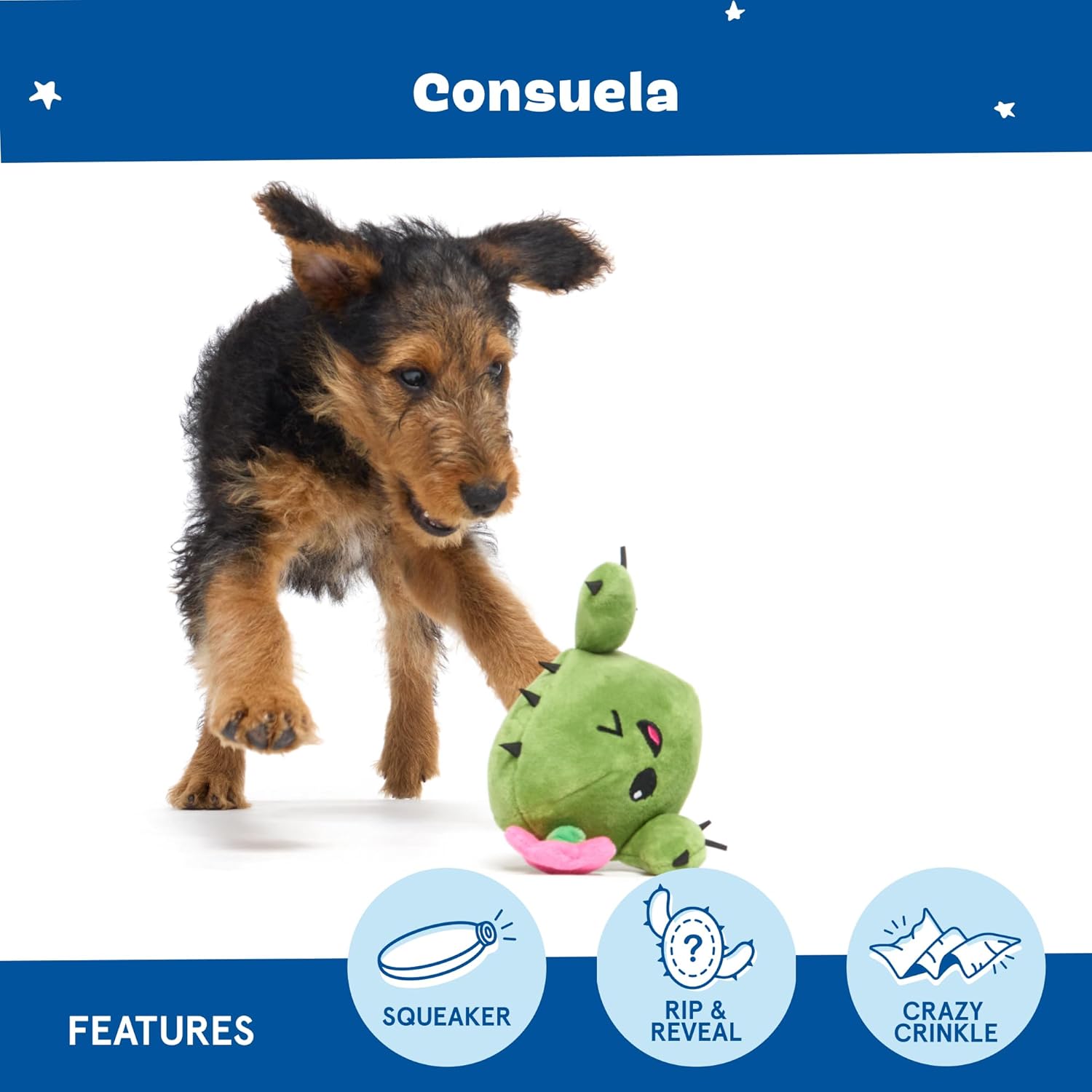 - Meet Consuela the Cactus: A customer favorite, she's our cuddly cactus dog toy! She's packed with fluffy stuffing and interactive elements - perfect for shredding, trashing, and squeaking! With a built-in squeaker, she's sure to make playtime last! Get ready for fun-filled destruction with Consuela