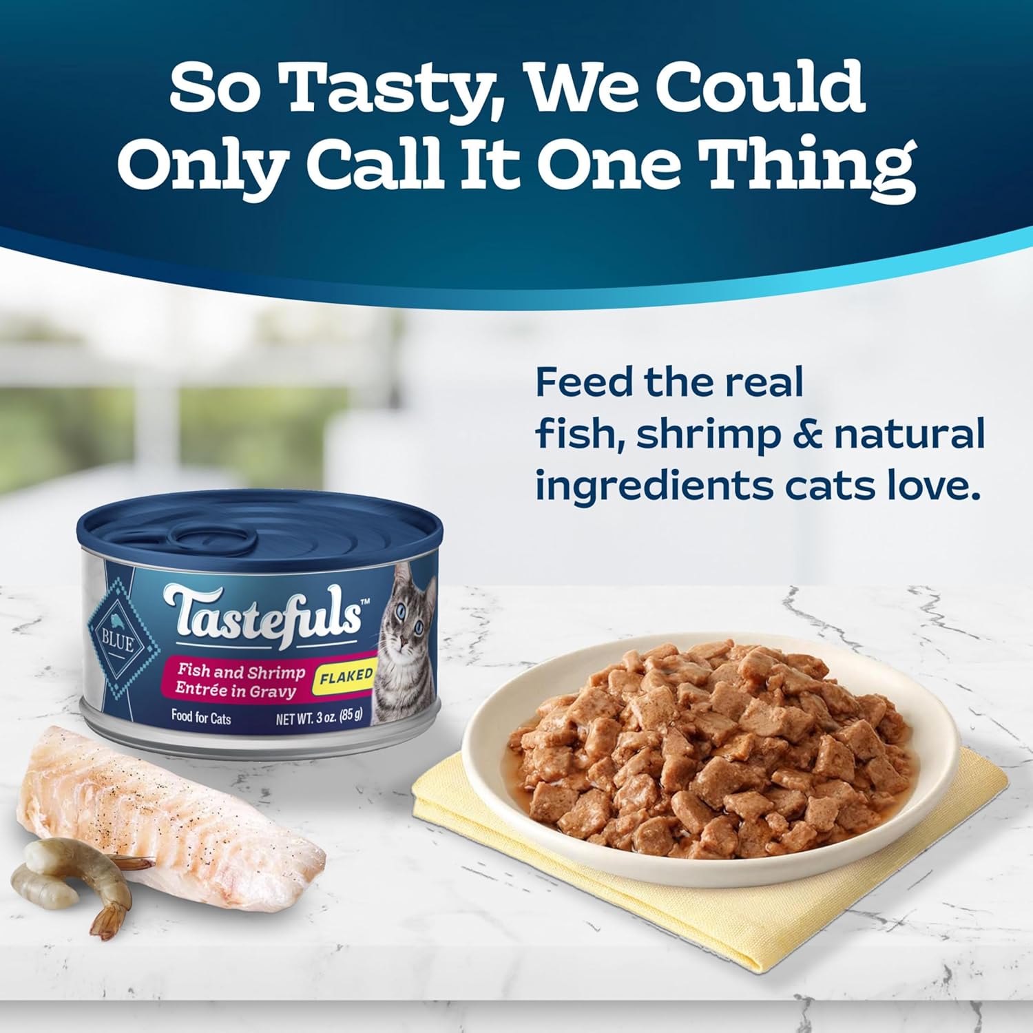 - Contains: Twenty-four (24) 3-oz cans of BLUE Tastefuls Flaked Wet Cat Food, Fish & Shrimp Entrées in Gravy