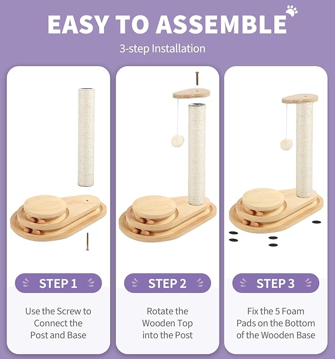 - 【4-Step Installation, Tools Included】:Follow the Instructions, the cat scratcher takes only 4 steps to assemble the 6 boards and 1 pole, your furry friend can enjoy this toy in a few minutes’ waiting.