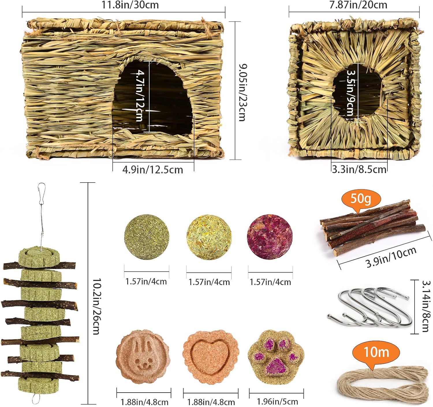 - ๐PACKAGE INCLUDE: 1 bunny grass house, 50g apple tree branch, 1 grass cake skewer, 4 S-shaped hooks, 10 meters rope, 3 flavors of round grass balls,1 flavor of heart-shape grass ball, 1 flavor of rabbit-shape grass ball, 1 flavor of paw-shape grass ball