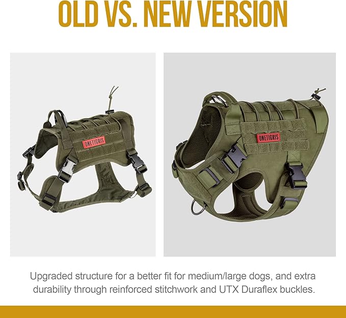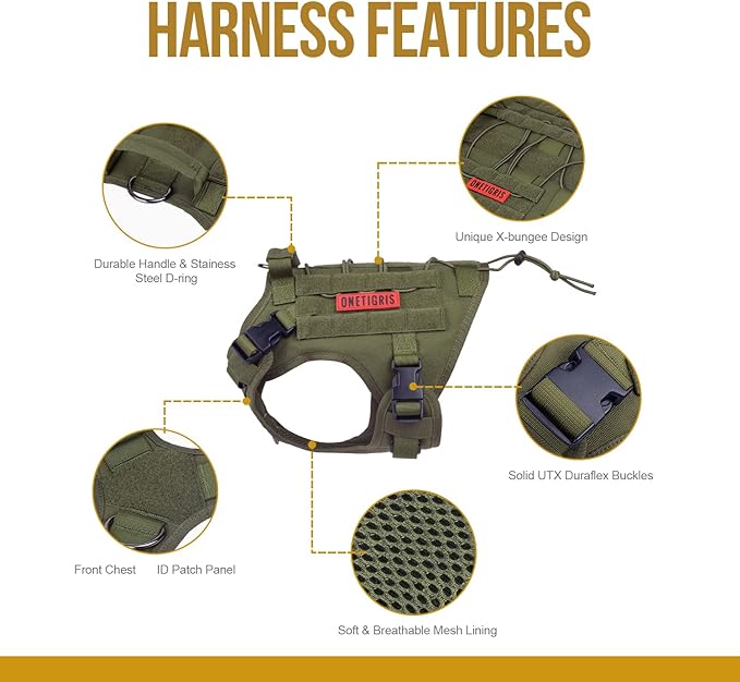 - MOLLE System & Military Style: Each side features two MOLLE straps as well as hoop & loop strips panel to easily attach molle pouches or ID panels; OneTigris harness is not designed to bear heavy weights and we advise against relying solely on the grab handle to carry your dog
