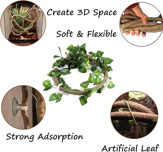 - EXTENSIVE USE: Perfect for arboreal reptiles and amphibians.Great for lizards,chameleons, tree frogs, geckos, tortoises, Hermit Crabs,snakes and other reptiles,perfect for small or medium sized reptiles. Amphibiansor double the vine up to make a sturdier climb comes with suction cups to attach to the glass and support the vine