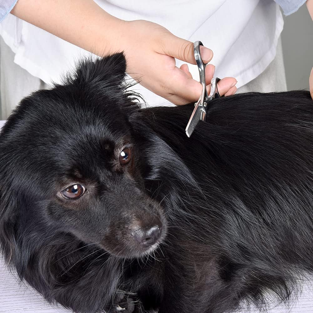 - 【 ADJUSTABLE AND SILENCER DESIGN 】 Pet grooming Scissors tool for dogs and cats. Can tightness of the blade can be adjusted by tightening or loosening the screw in the middle of the dog scissors according to the thickness of the pet hair for easy use. There is also a silencer pad on the handle, Can provide quiet grooming for your cats or dogs, which makes your pet will not be as scared as electric clippers.