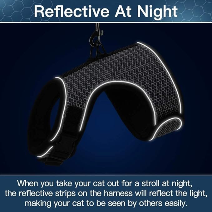 - Quality Material: The harness is made of durable polyester, and we adopted an air-mesh design, which is very soft and breathable for cat wearing. Even though on hot days, your cat still will feel cool and comfortable. Besides, the harness is so lightweight, your cat won't feel any pressure during walking or running