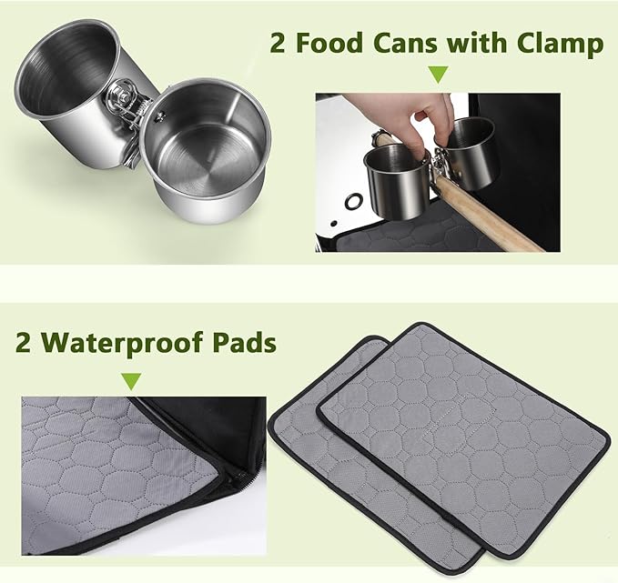 - ๐พ Other Features: โ 2 removable food cans for easy feeding and drinking. โก2 waterproof pads, can be washed and reused. โขBuilt-in escape safety rope make it can be used as a daily pet bag.