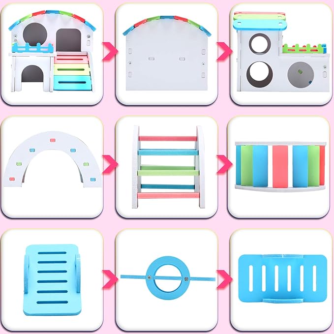 - Cute design: the hamster's nest is designed with double layer vaulted roof and curved ladder, with its own retro style and fence balcony, elegant and beautiful; And the rainbow bridge adopts rainbow colors, bright and cool, the seesaw adopts the shape of wheels, which is very cute