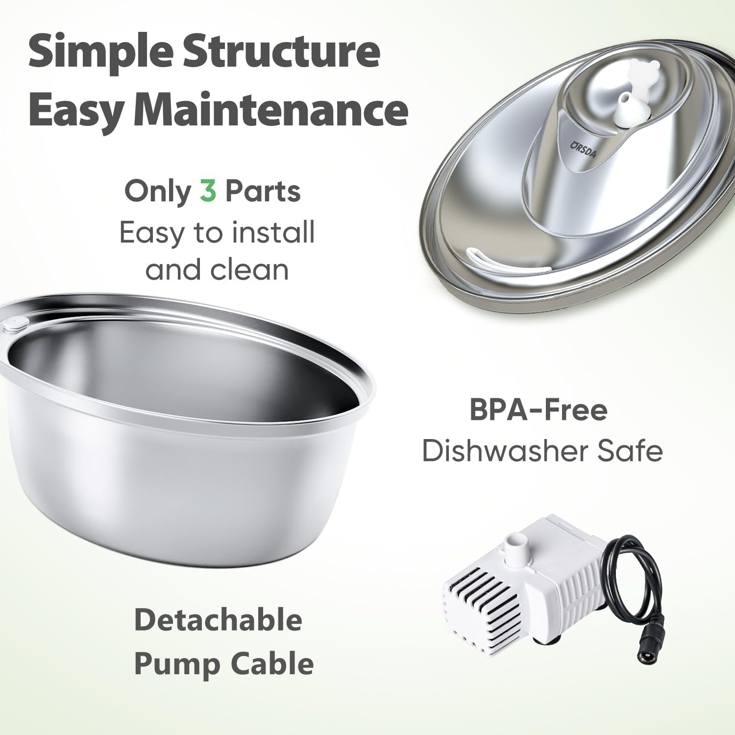 - ๐ธEase of Use and Cleaning -Dishwasher safe. The body of ORSDA automatic cat & dog water fountain only have 4 components: lid, base, filter and water pump. Even the spout is one-piece silicon designed for more thorough cleaning. Humanity-centered design of the water pump cable, it is detachable for easy cleaning too.