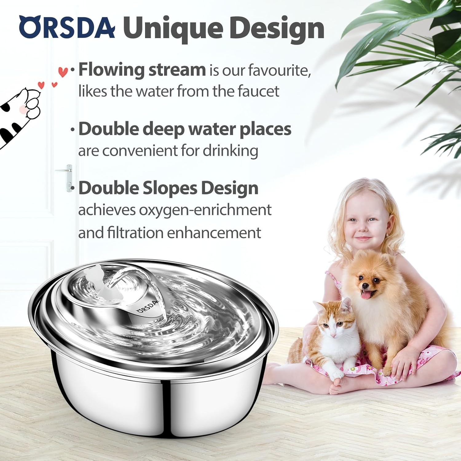 - ๐ธORSDA Attained Utility Model Patent & Design Patent Certificate - ORSDA 100oz/3L stainless steel pet water fountain is professional designed for cats, small & medium dogs. Two inclined planes are not only for oxygen-enrichment, but also for pets to lick. Satisfy pets`deep water needs.Two types of spouts meet different pets` preferences. very suitable for multi-pet families. No need to refill frequently.