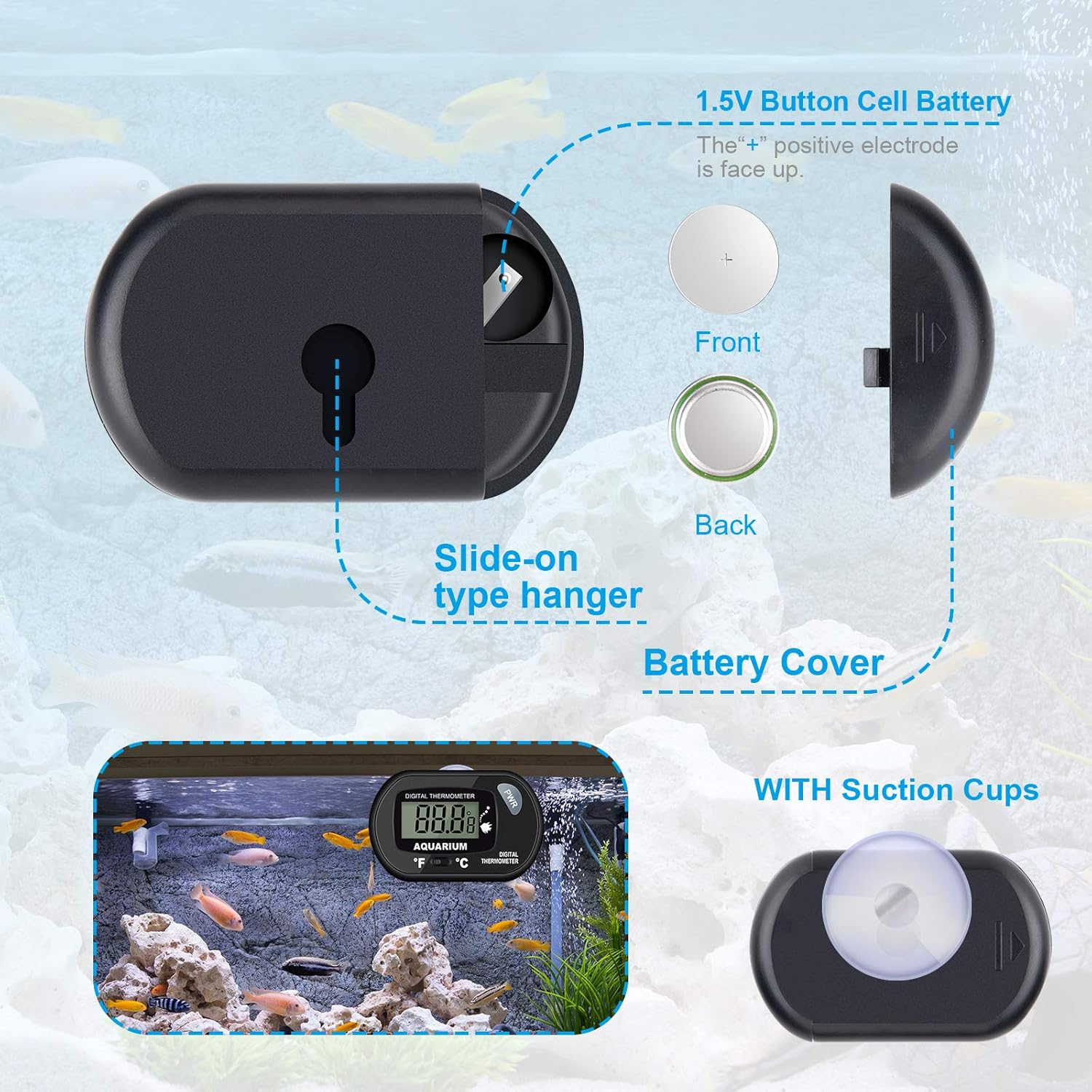 - Package Includes: Aquarium Thermometer 2 x Digital Aquarium Thermometer; 2*LR44 battery(Included); Gift: 2*LR44 spare battery; 4 x Suction cup mounts.