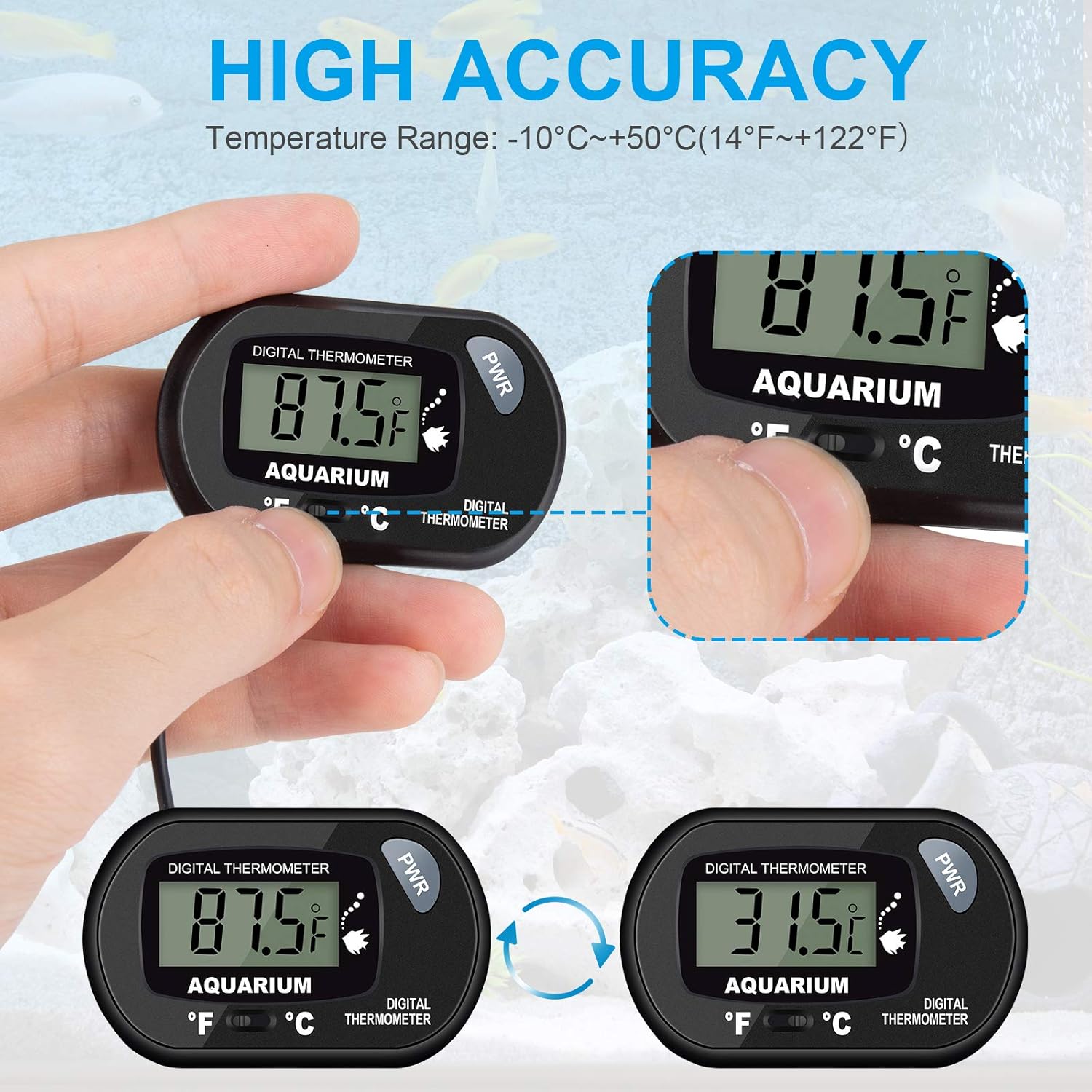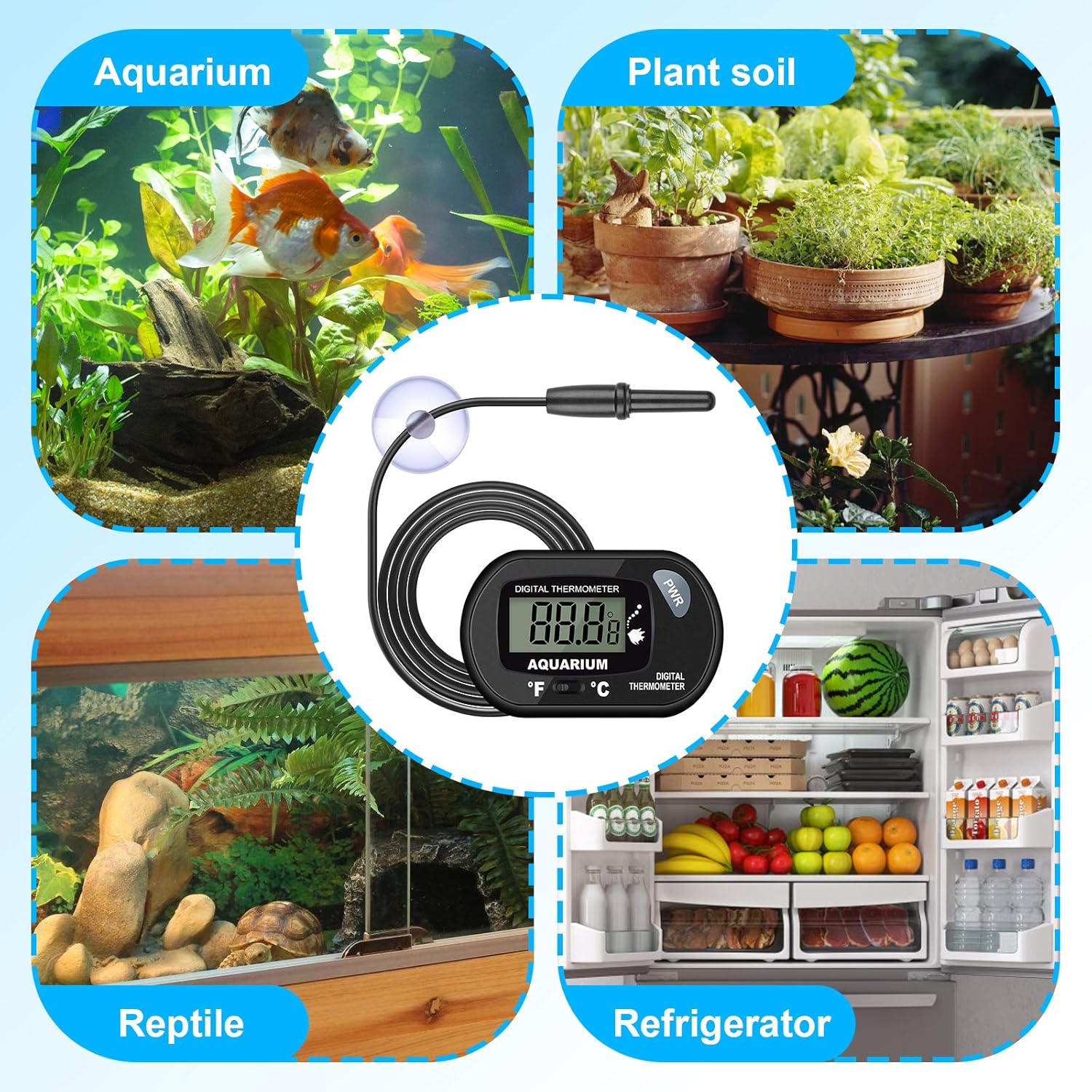 - PRODUCT MATERIAL: Aquarium Thermometer uses a high-precision stainless steel sensor probe to measure the water temperature of the aquarium. The main unit uses a professional LCD display to solve the problem of not knowing the temperature of the fish tank, thus providing a healthy and comfortable water environment for all kinds of fish.
