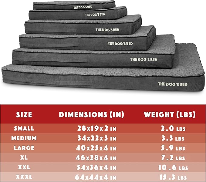 - Small Grey Plush 28x19x2” waterproof orthopedic dog bed. Solid 1” high density, orthopedic memory foam over a solid 1” base of high stability support foam with covers designed so that your bed fits your home decor seamlessly and your dog can stay close to your family
