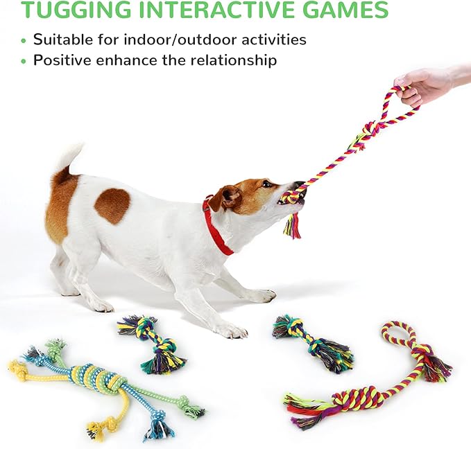 - SAFE PUPPY TEETHING CHEW TOYS: Get the dog’s favor while letting you rest assured. Chew toys for dogs are made of tight, multi-colored cotton ropes which are 100% natural, no plastic/glue, and absolutely safe for your pet. Play the role of dental floss, thousands of fibers penetrate every corner of puppies' mouth, so that they can get gum massage and relieve stress, reduce the formation of tartar and dental plaque when playing. Perfect size for puppies and small-medium breeds of dogs