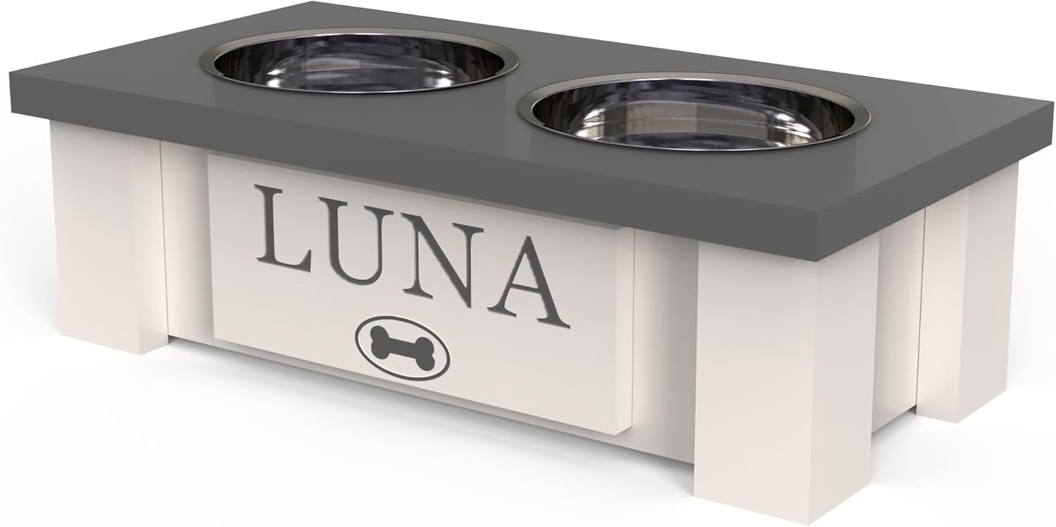 GrooveThis Woodshop - Personalized Elevated Dog Bowl Stand for Large, Medium, Small, X-Small Dogs - Stainless Steel Food and Water Bowls - Raised Dog Dish with Internal Storage (X-Small, Grey)