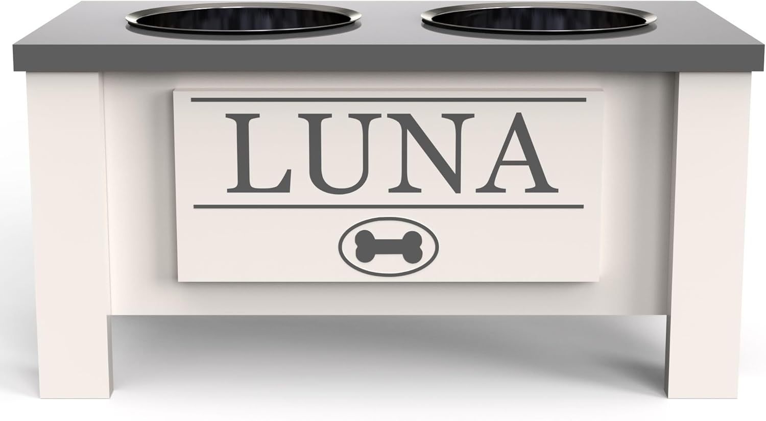 GrooveThis Woodshop - Personalized Elevated Dog Bowl Stand for Large, Medium, Small, X-Small Dogs - Stainless Steel Food and Water Bowls - Raised Dog Dish with Internal Storage (Medium, Grey)