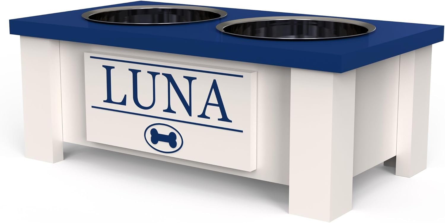 GrooveThis Woodshop - Personalized Elevated Dog Bowl Stand for Large, Medium, Small, X-Small Dogs - Stainless Steel Food and Water Bowls - Raised Dog Dish with Internal Storage (Small, Blue)