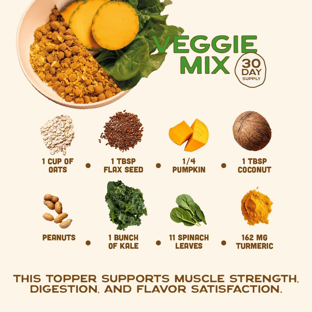 - HELP YOUR DOG EAT THEIR VEGGIES: Dogs need their veggies too, which is why we created this delicious vegetarian dog food topper. With real ingredients like kale, spinach, oats, nuts & seeds, your picky pup will have a balanced diet with all the nutrients they need, plus a tasty treat to top their meal!
