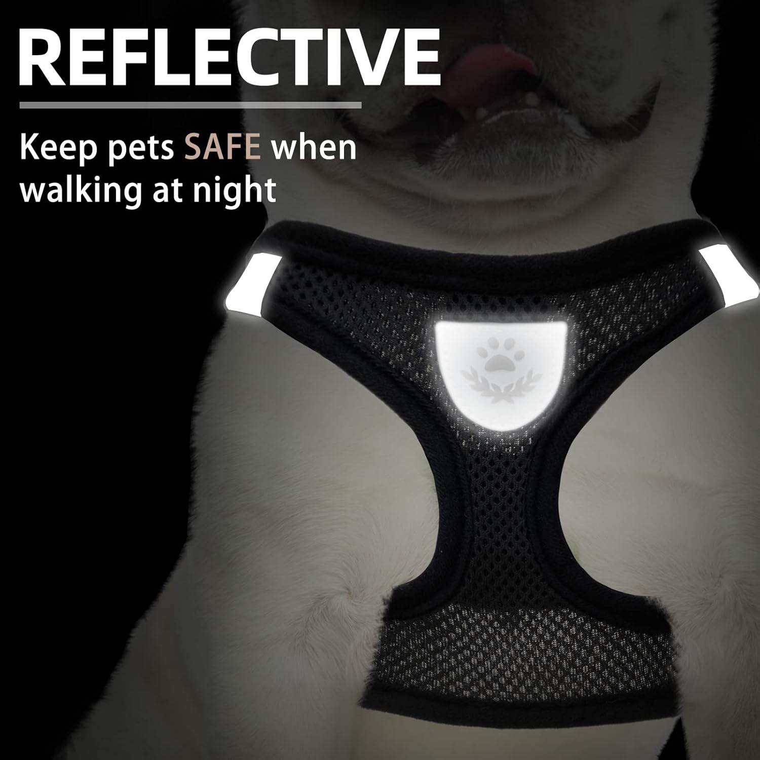 - [COMFORTABLE MATERIAL, DAILY WALKING, FOUR SEASONS WEARING] - The harness is made of durable polyester, and it's adopted with an air-mesh design. The whole harness is very soft, lightweight, and breathable. Even if your dog wears it all day, he won't feel any discomfort. For daily walking or running, it is a very easy thing to do. Besides, this is a four seasons harness, it keeps the dog cool on hot days and keeps the dog warm on cold days.