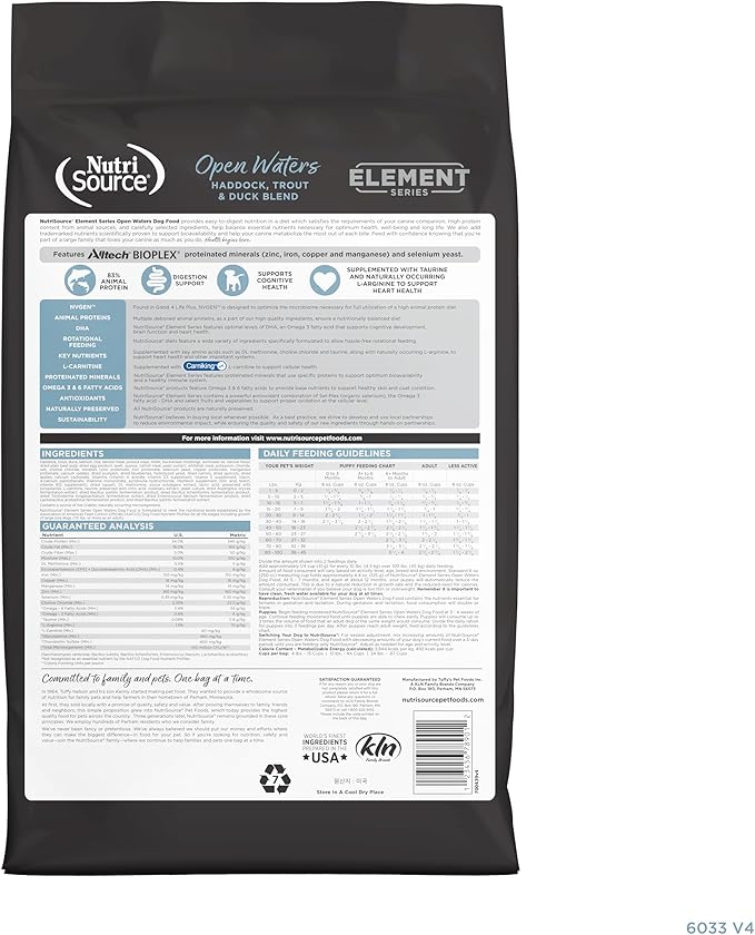 - As a member of our grain inclusive series, NutriSource Element Series Open Waters Dry Dog Food is formulated to meet AAFCO guidelines for all lifestages