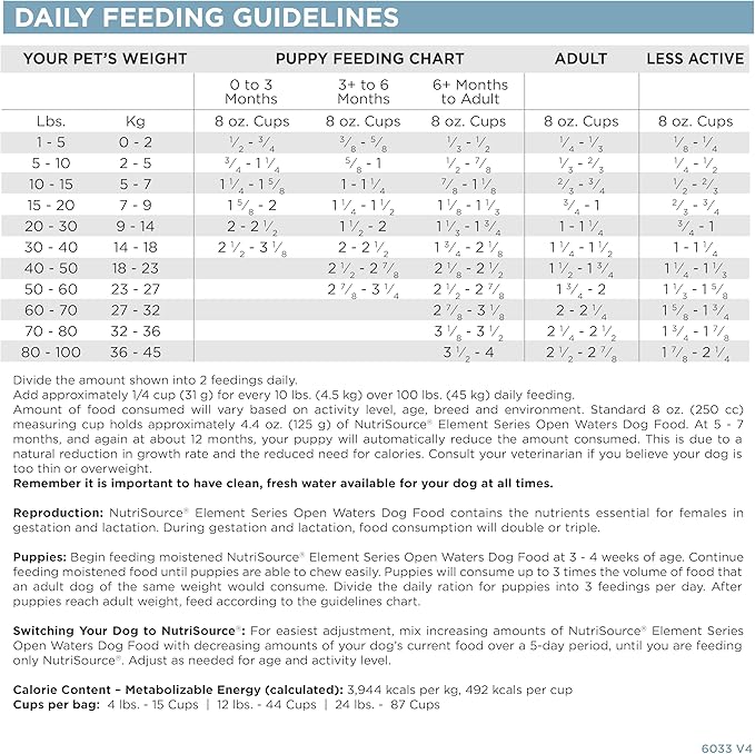 - CONTAINS: (1) 12LB Bag of NutriSource Element Series Open Waters Dry Dog Food