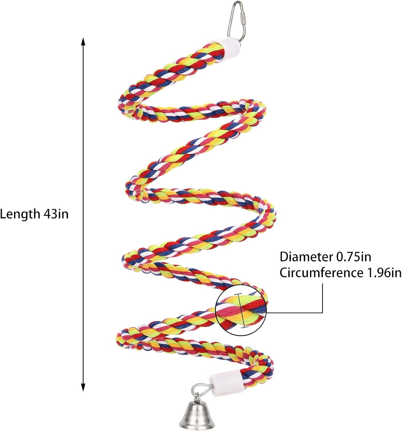 - ๐ฆ[WHAT YOU GET] 2pcs 43โโ length soft cotton rope bird spriral perch with metal bell,fully closed/open hook can hang in birdcage or outside safety,bendable internal steel wire can re-sharp it provide more fun for your pets