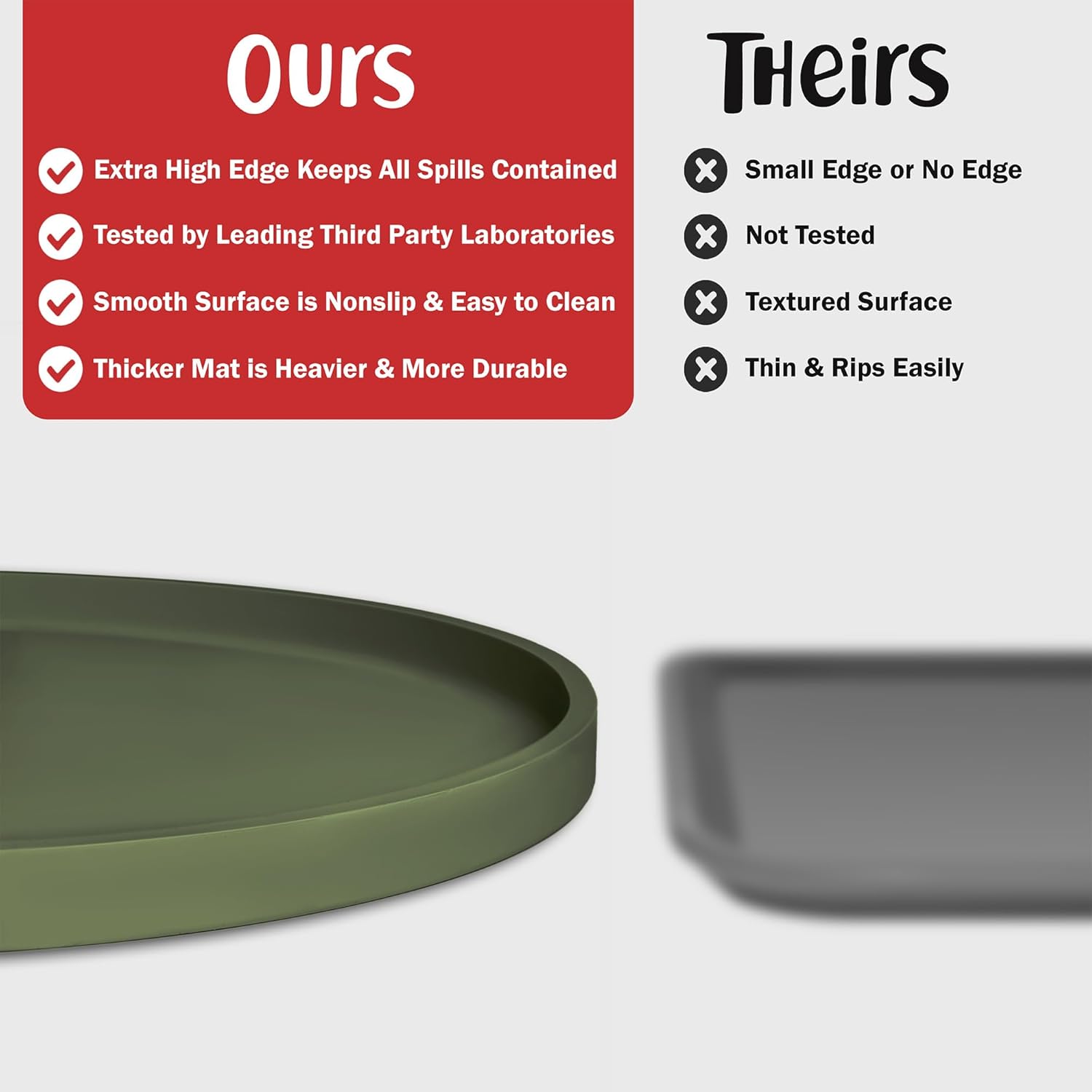 - EFFECTIVE: Super high and thick outer lip (edge) keeps all spilled food and water splashes contained on the pet food mat and away from your floor. Silicone is naturally 100% waterproof. Clean lines and multiple color options allows it to blend seamlessly with any décor.