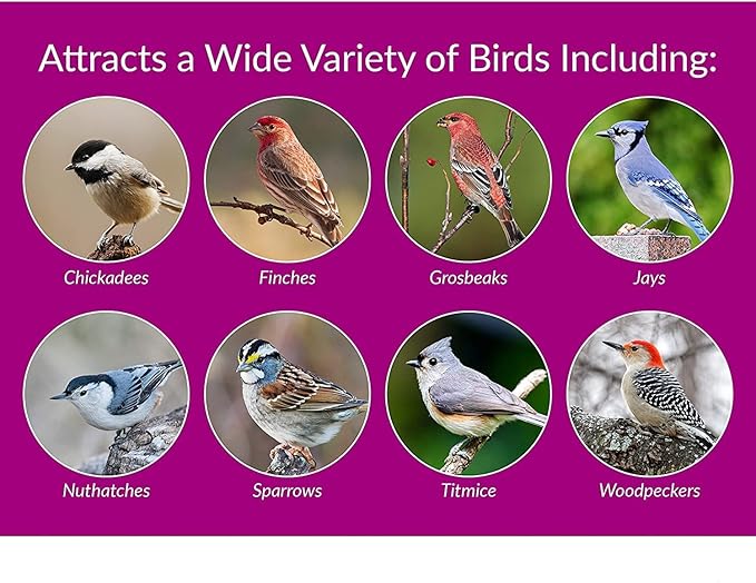 - Attracts: Cardinals, Finches, Robins, Blue Jays, Titmice, Chickadee, Pine Siskins, Nuthatches and many more