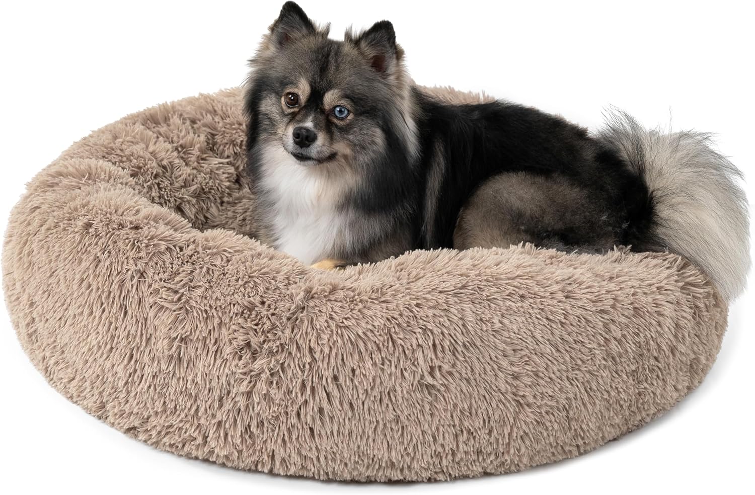 - CALMING ROUND DOG BED: Circular dog beds provides a calming and anti-anxiety experience for your pet to cuddle and burrow. The donut dog bed provides a sense of comfort and security while your pet sleeps. Made with fluffy and warm faux fur shang, this cat bed is cozy, soft, and especially comfortable.