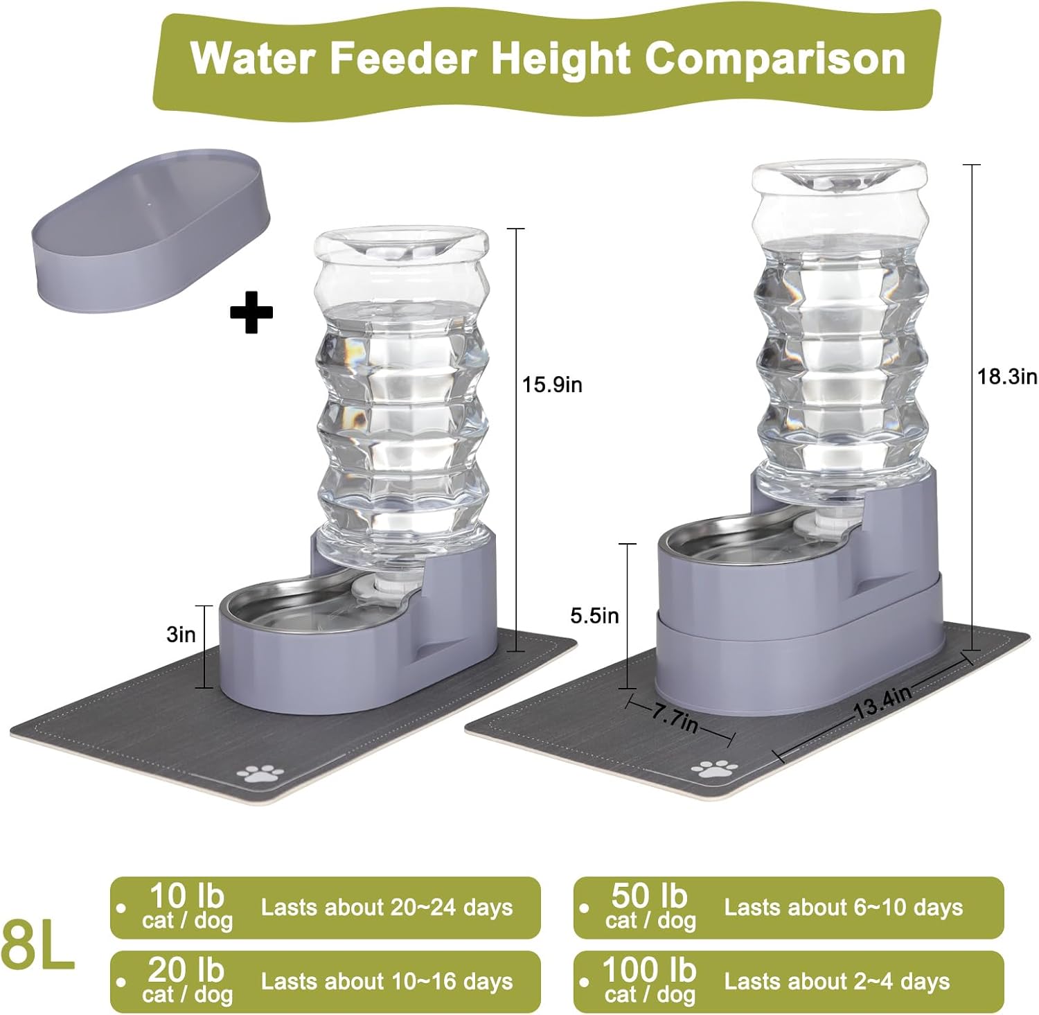 RIZZARI Large Water Dispenser for Dogs: 8L Gravity Gray Automatic Stainless Steel Waterer - 100% BPA Free - Raised Pet Feeder for Senior Dogs with Joint Pain in Bedroom Garden