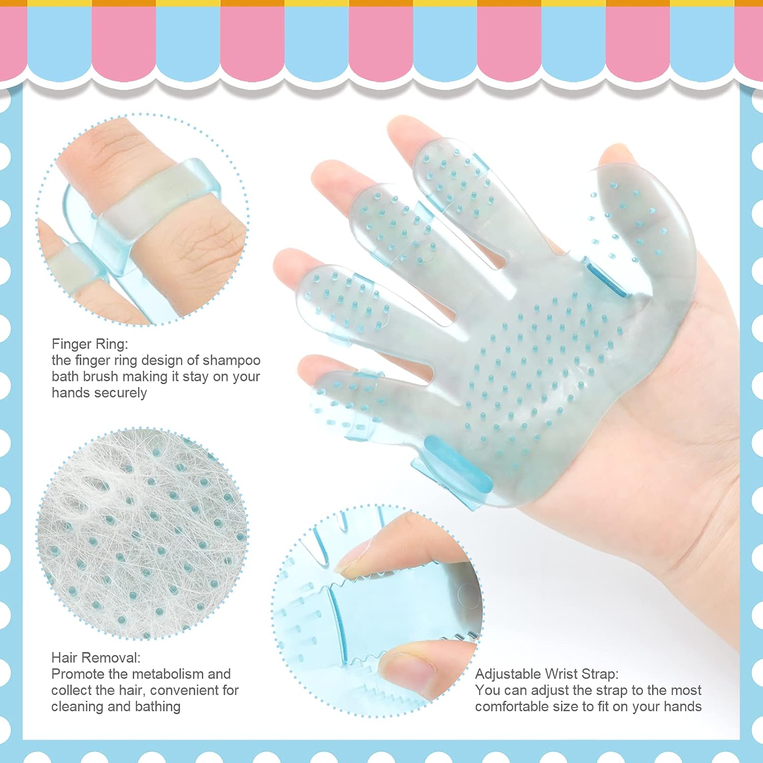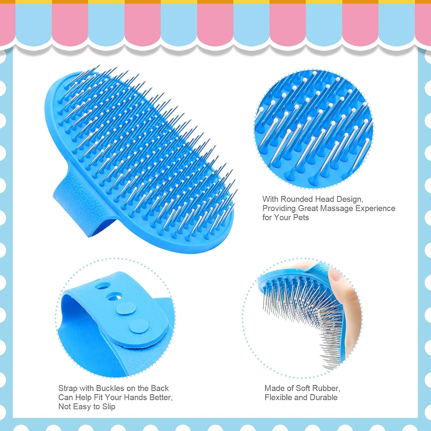 - Pet Bath Brush: It is made of soft and elastic rubber, the wrist strap can be adjusted according to the size of your hand, convenient and practical. You can massage your pets while bathing them, it can also promote the metabolism and collect the hair, convenient for cleaning