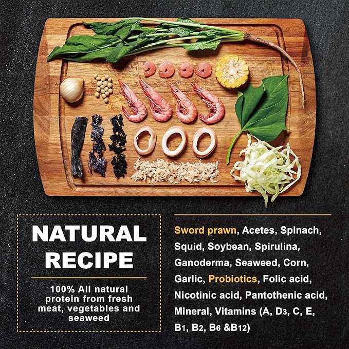 - Superior Quality Ingredient : All natural protein from fresh meat, vegetables and seaweed. No additives, no artificial flavors or coloring, no byproducts and other harmful ingredients. Made from carefully selected ingredients like Sword prawns, akiami paste shrimps organic spinach, fresh squid, fresh-pick garlic, natural spirulina and seaweed