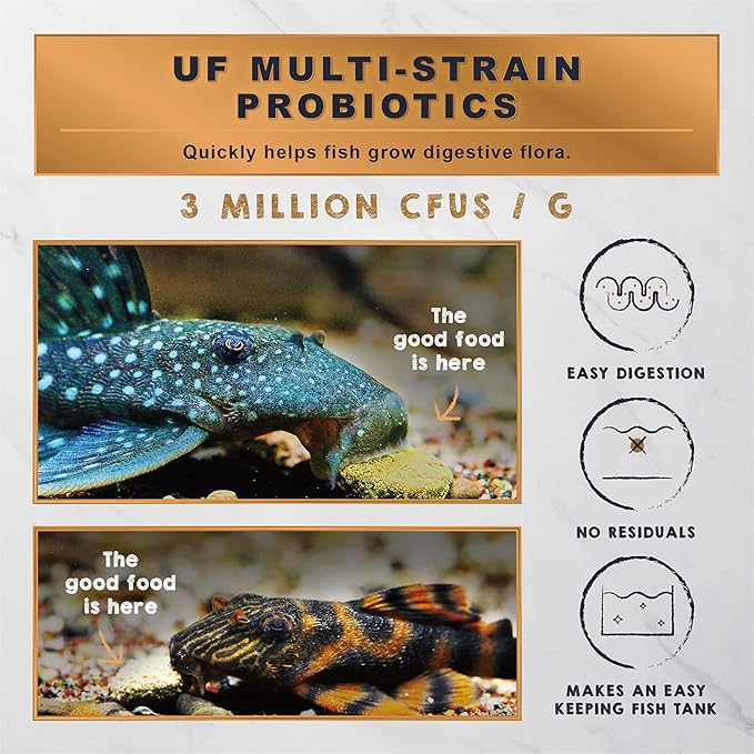 - PET SUPERFOOD It's not only tasty, but it also keeps pleco healthy! Our food is jam-packed with vitamins (A, C, D3, E, B1, B2, B6, B12) great for reaching full potential in size, color, fins, and A+ immunity!