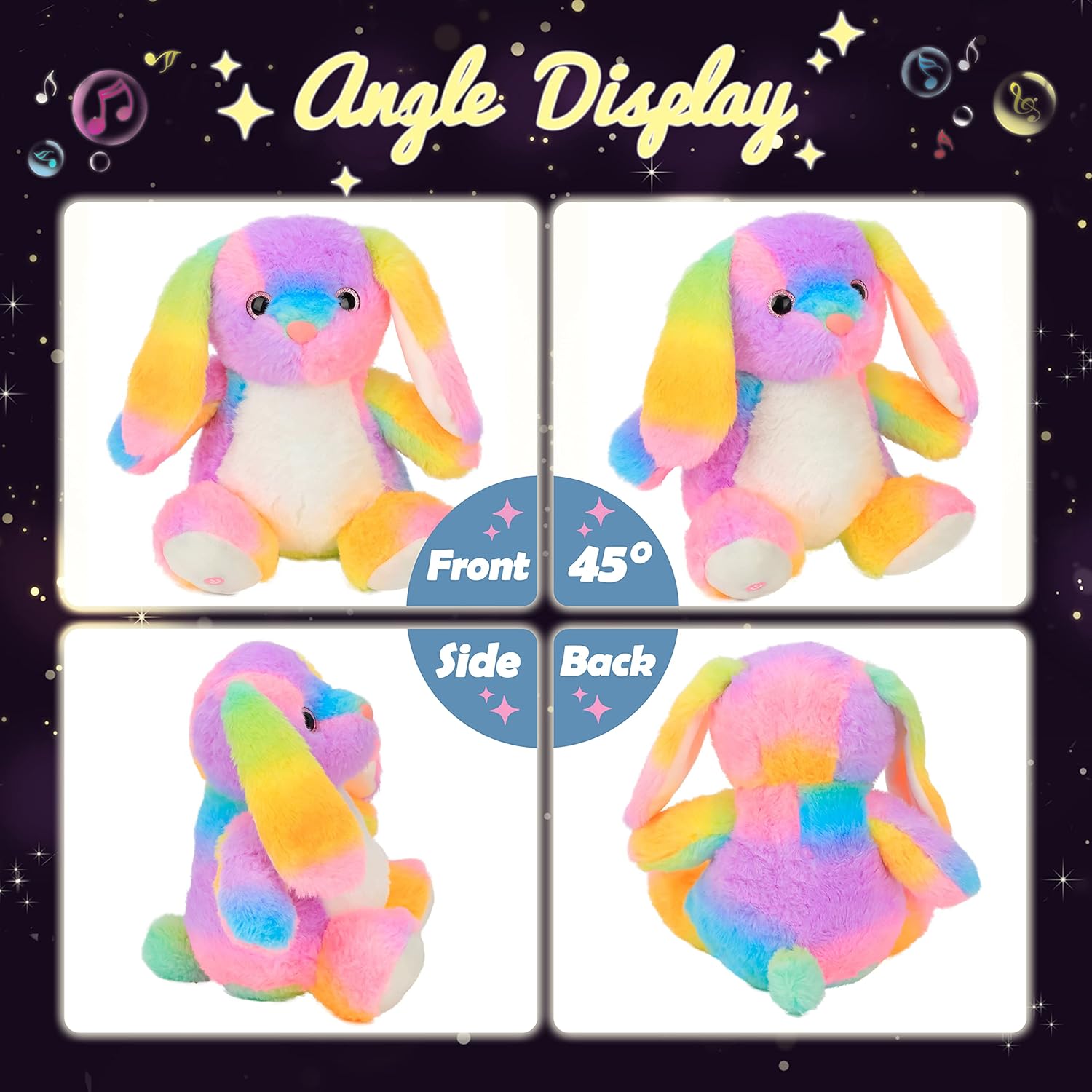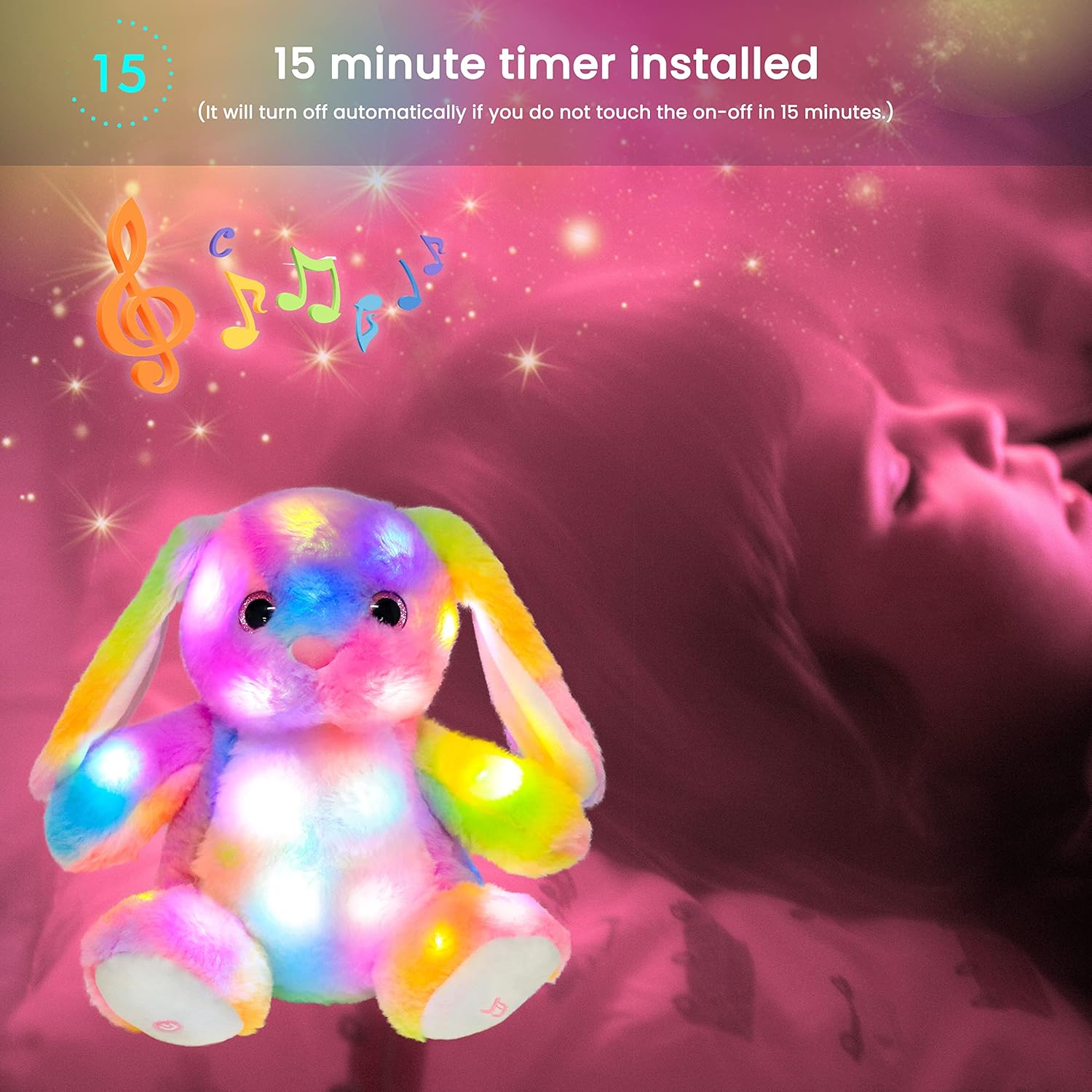 - MUSICAL LIGHT UP PLUSH: This stuffed animal glows in the dark. The magical rabbit features a soothing lullaby sound and a color-changing glowing effect. Light up your kid's dormitory and help reduce the anxiety caused by the dark in your little ones. There are 10 songs are contained. Your kids can learn to sing with it and will get much fun.