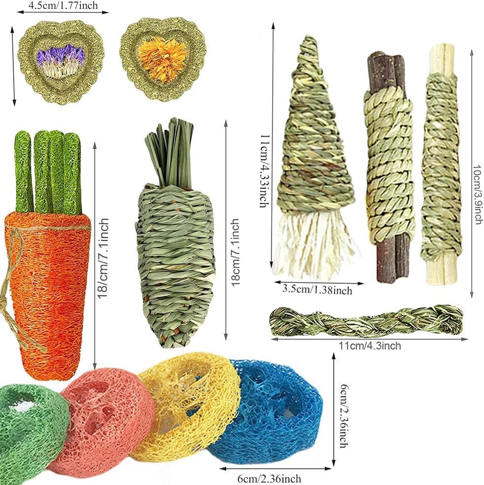 - MUTIPLE OPTIONS:They provideroughage which is good for digestion and may aid in relieving intestinal inflammations and mild pain These rabbit toys can promotes clean and healthy teeth while help prevent boredom