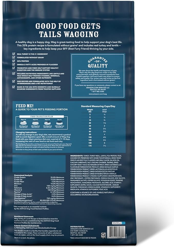 Amazon Brand - Wag Dry Dog Food Grain-Free Turkey & Lentil Recipe, High Protein (24 lb bag)