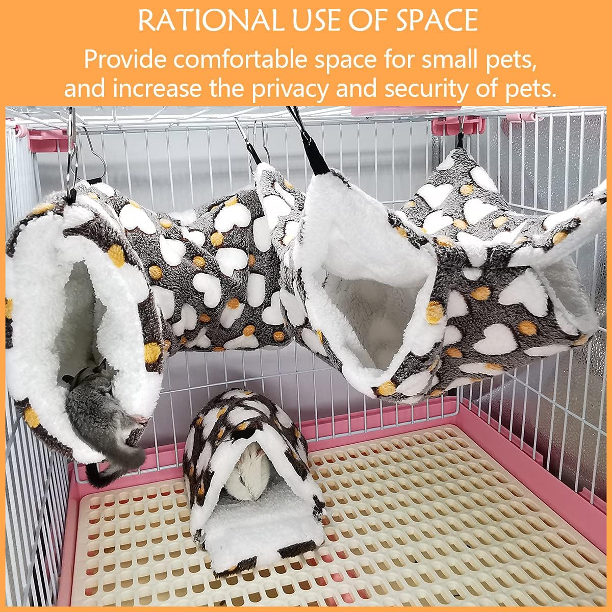 - RATIONAL USE OF SPACE: The hanging tunnel has 3 sturdy hooks, and the bunkbed hammock has 4 durable hooks, which can be hung in a cage or other places. They can make rational use of space and make the pet cage more three-dimensional