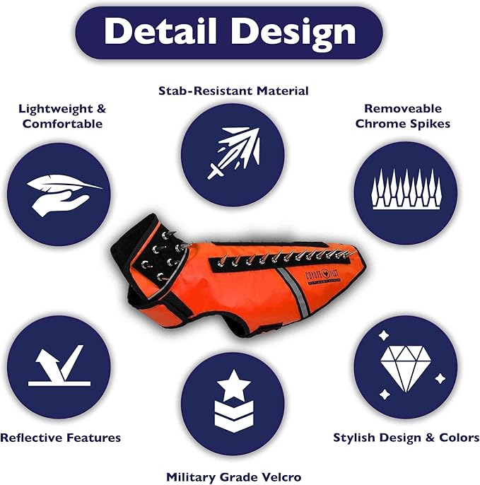 - NECK AND BODY PROTECTION: SpikeVest includes a vest with removable chrome spikes; Neck spikes and 2 strips of spikes for the back. Made with super tough puncture resistant Cordura fabric that's stab-resistant to withstand the sharp canine teeth of coyotes and aggressive dogs.