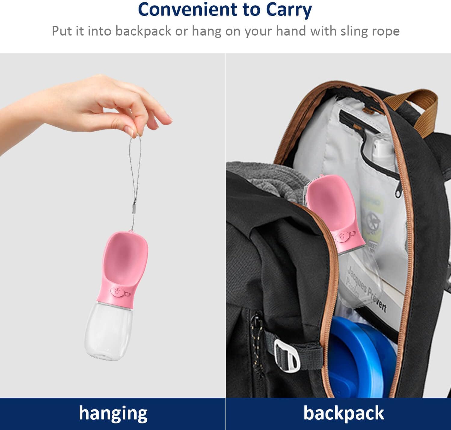 - [Convenient to Carry]: Enough capacity and compact water bottle design is great for your pet dog or cat when outdoor walking, running, hiking, traveling or playing, etc. You can put it into backpack or hang on your hand with sling rope, very easy to carry to anywhere you want.