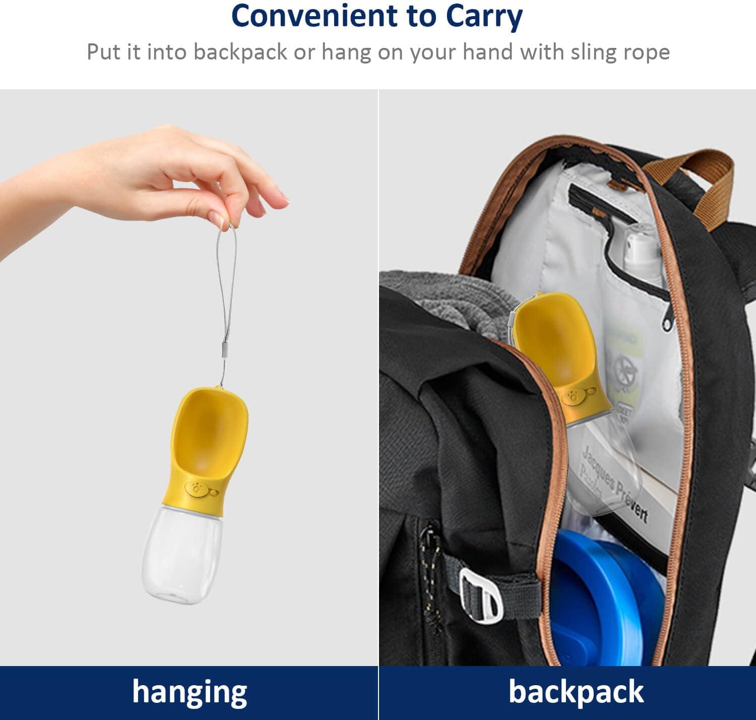 - [Convenient to Carry]: Enough capacity and compact water bottle design is great for your pet dog or cat when outdoor walking, running, hiking, traveling or playing, etc. You can put it into backpack or hang on your hand with sling rope, very easy to carry to anywhere you want.