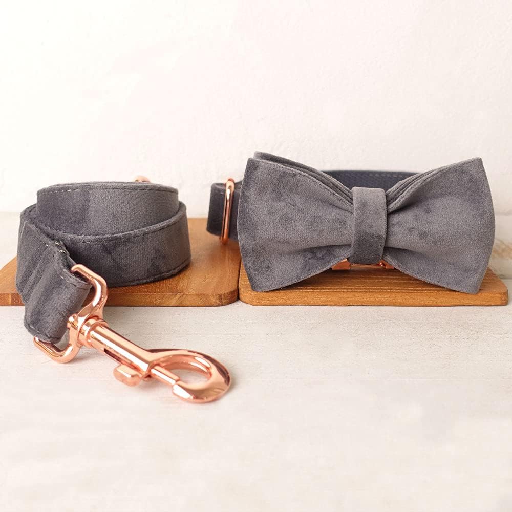 PETDURO Custom Dog Collar Personalized with Name Engraved Quick Release Rose Gold Metal Buckle for Large Medium Small Girl Dogs - Dog Leash and Bow Tie Available - Soft Comfy Velvet (Grey, S)