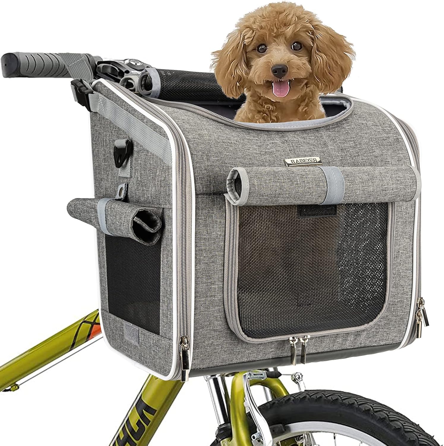 - Expansion Bike Dog Carrier: The dog bicycle basket right sides expandable to create extra room of our spacious pet bag for your cats or dogs to stay comfortable, the left side pocket for you to store folding dog bowls, toys, snacks, poop bags, etc. It is easy to fold into one piece for storage in the drawstring bag (included)