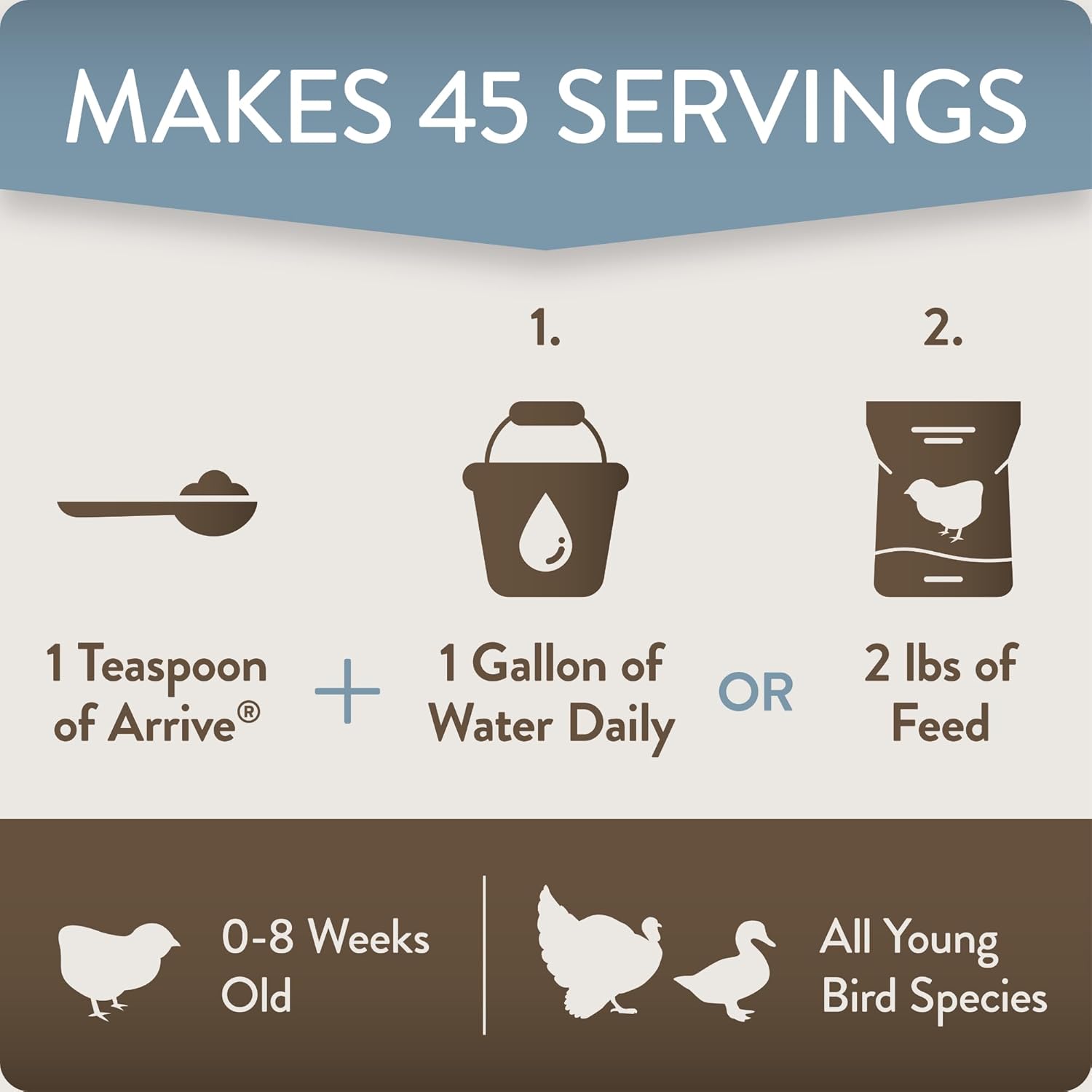 - SAFE FOR ALL POULTRY SPECIES: Add one teaspoon of Arrive per gallon of water or 2lbs of feed until chicks are 8 weeks old. For birds 8 weeks and older, we recommend FlockLeader Thrive.
