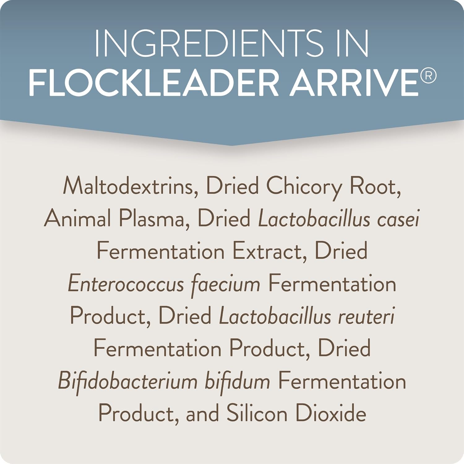 - A DAILY SUPPLEMENT FOR A HEALTHY START: FlockLeader Arrive is uniquely formulated with the right mix of probiotics, prebiotics, and plasma to support newly hatched and young, growing poultry up to 8 weeks old.