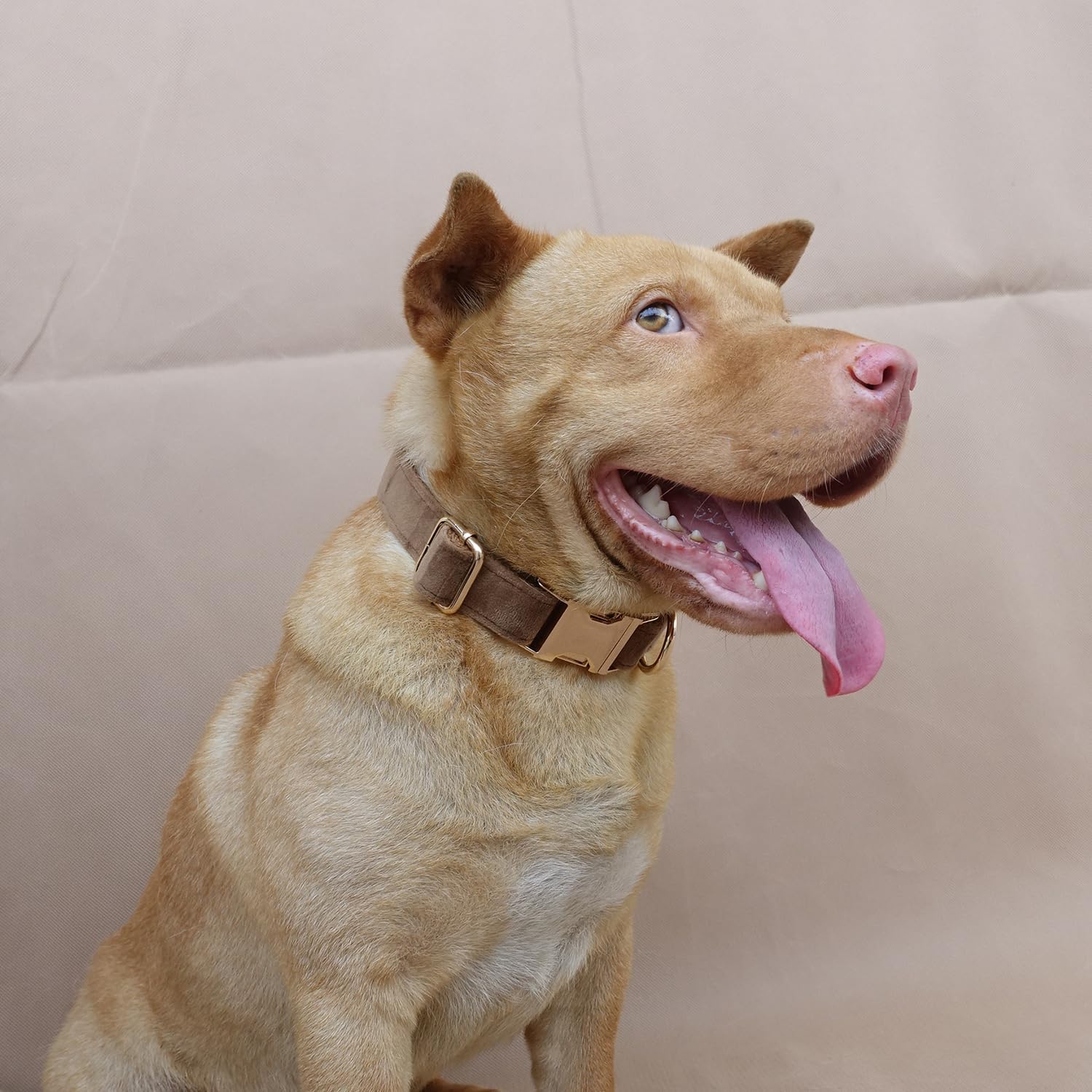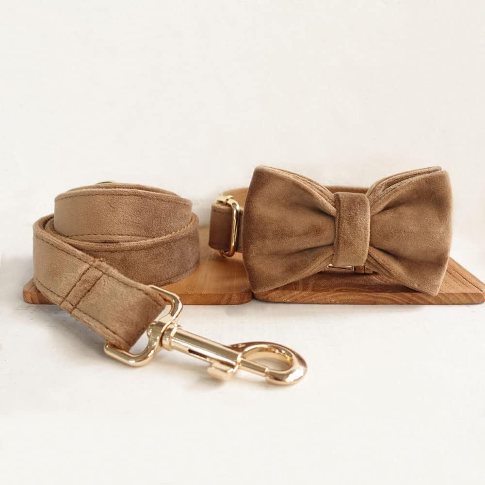PETDURO Custom Dog Collar Personalized with Name Engraved Gold Metal Buckle for Large Medium Small Dogs - Dog Leash and Bow Tie Available - Soft Thick Velvet (Camel RG, S)