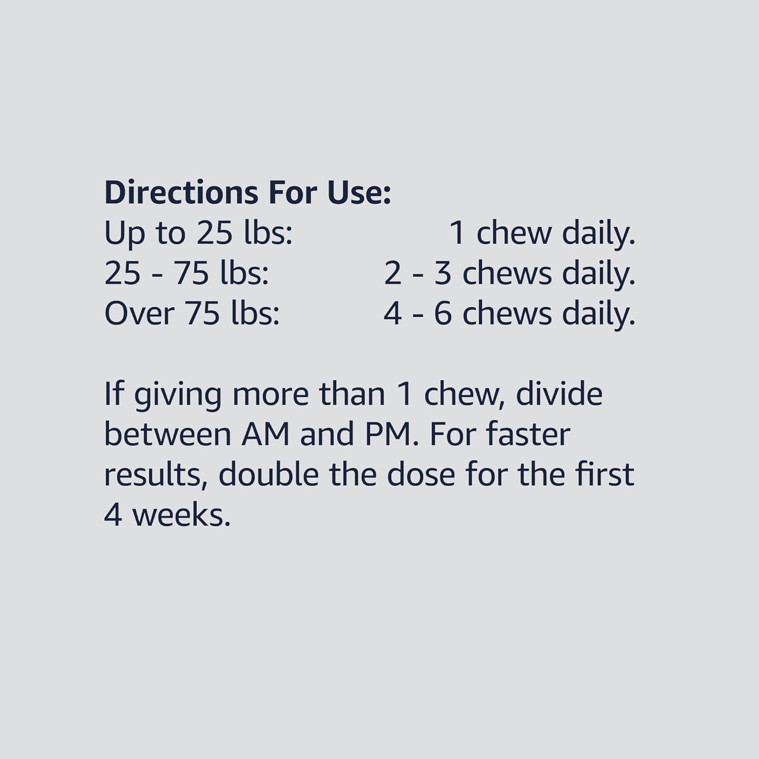 - Direction for use: 1 chew per day for dogs up to 25 lbs, 2-3 chews per day for dogs 25-75 lbs, 4-6 chews per day for dogs over 75 lbs