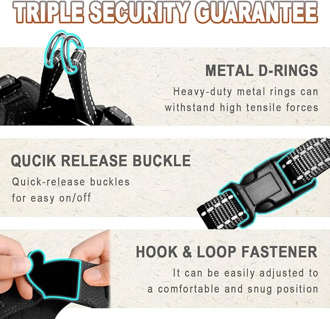 - 【Safety Guarantee】: 3 Layers of security, the hook and loop panel on the back works with a buckle and two D rings to keep your pet secure. 3M Reflective ensure him is highly visible and safe at night.