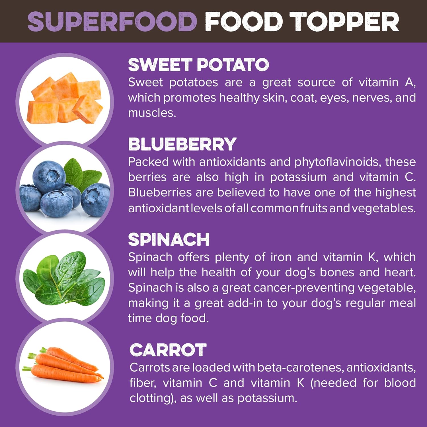 - Just 4 Superfood Ingredients - You don't have any need to be concerned for fillers or strange ingredients as our dog food mixers toppings come with just 4 superfood ingredients that are healthy for dogs: blueberries, spinach, carrots, sweet potatoes.