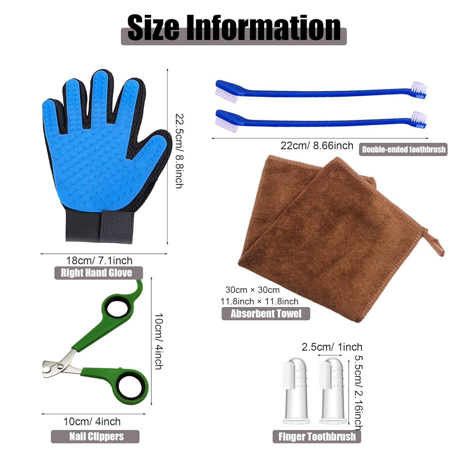 - Package includes: 1 x long needle hair grooming brush, 2 x silicone massage brush, 2 x double-sided comb, 1 x long flea comb, 2 x finger toothbrush, 1 x nail clippers, 2 x double-ended toothbrush, 1 x right glove removal brush, 1 x cleaning cloth.